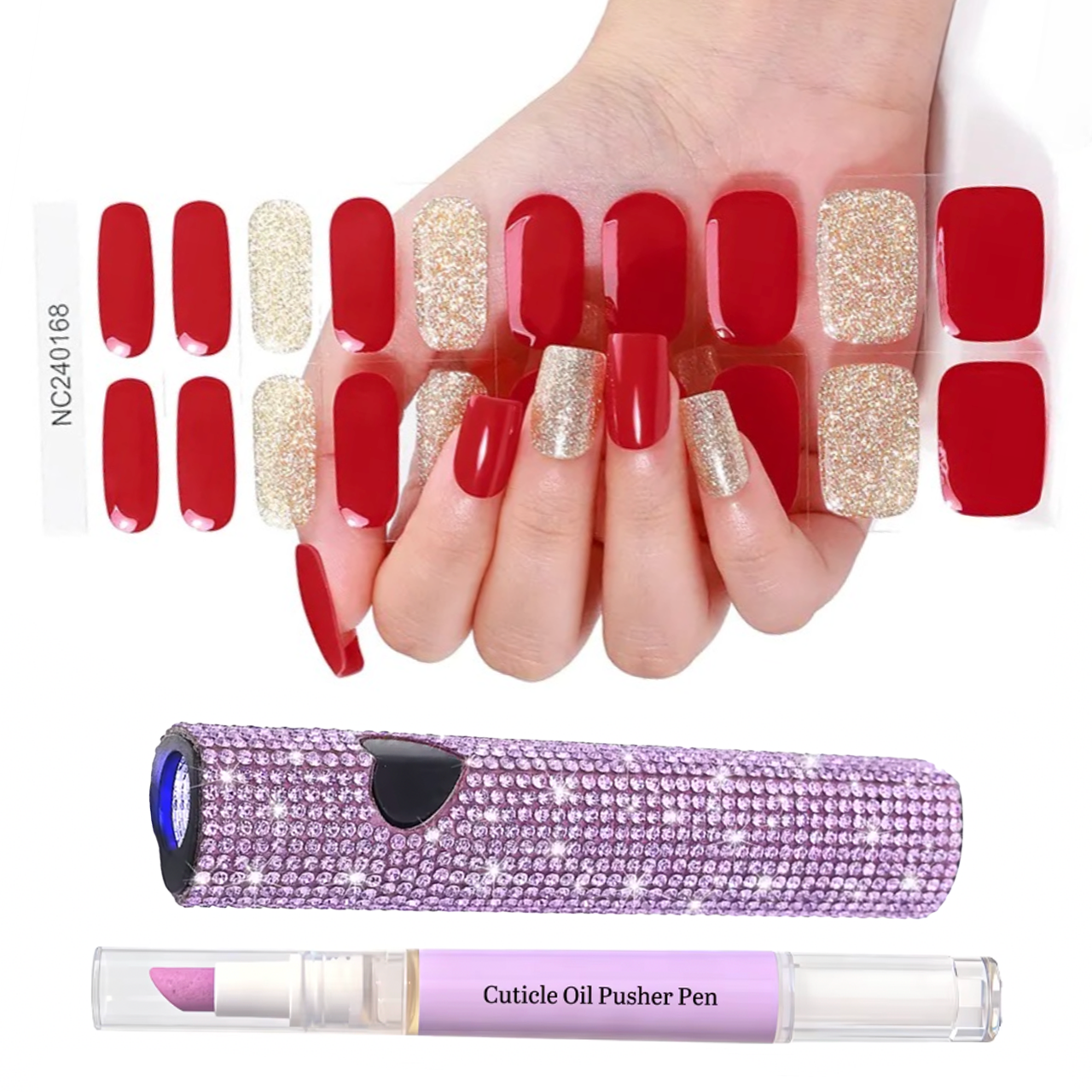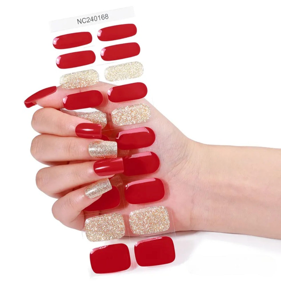 Complete semi-cured gel nail stickers kit including a rhinestone UV lamp and a nourishing remover care oil enriched with natural lavender essential oil, designed for a precise application, easy removal, and a professional salon-quality finish at home. For optimal wear and long-lasting results, the use of a top coat is recommended.