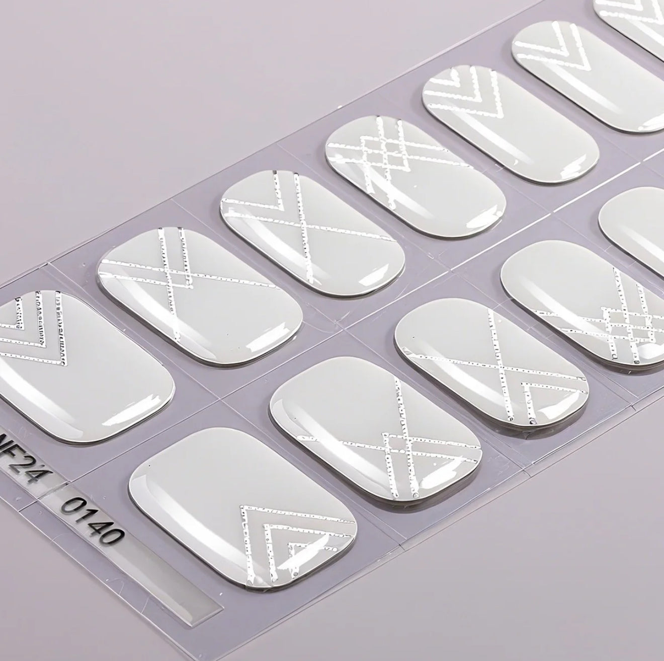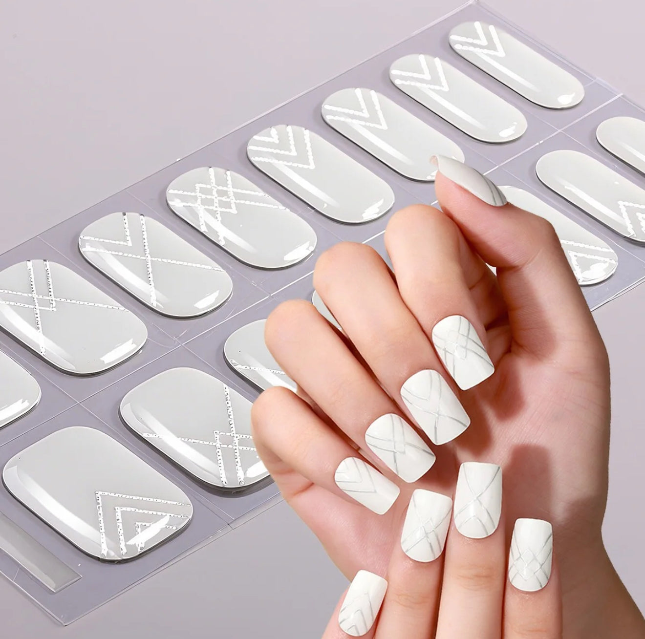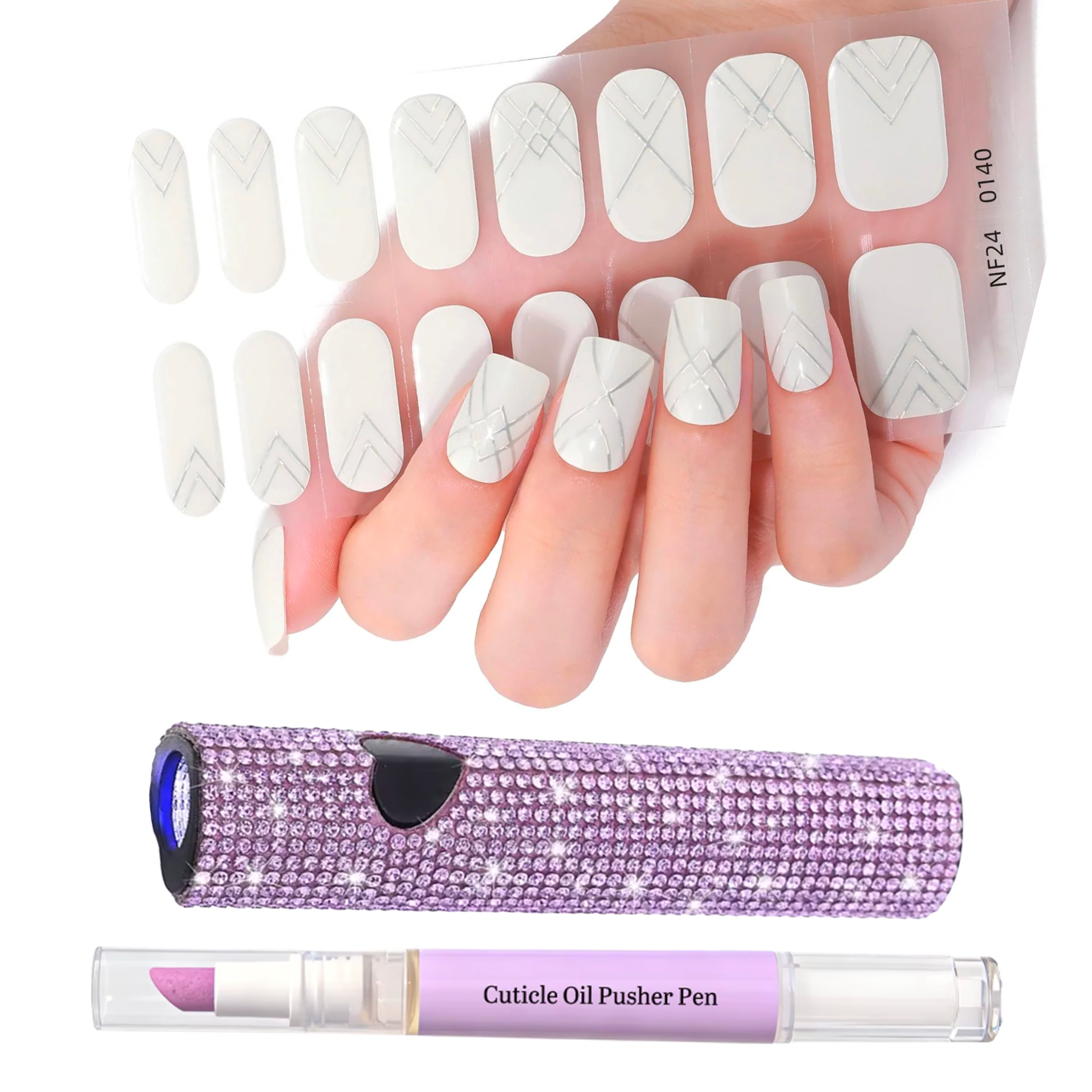 Complete semi-cured gel nail stickers kit including a rhinestone UV lamp and a nourishing remover care oil enriched with natural lavender essential oil, designed for a precise application, easy removal, and a professional salon-quality finish at home. For optimal wear and long-lasting results, the use of a top coat is recommended.