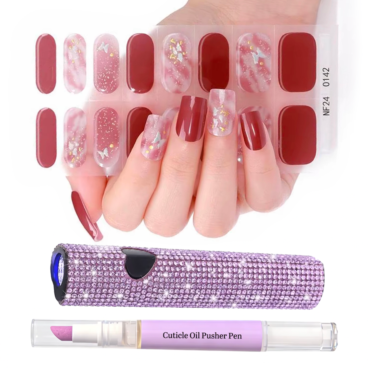 Complete semi-cured gel nail stickers kit including a rhinestone UV lamp and a nourishing remover care oil enriched with natural lavender essential oil, designed for a precise application, easy removal, and a professional salon-quality finish at home. For optimal wear and long-lasting results, the use of a top coat is recommended.