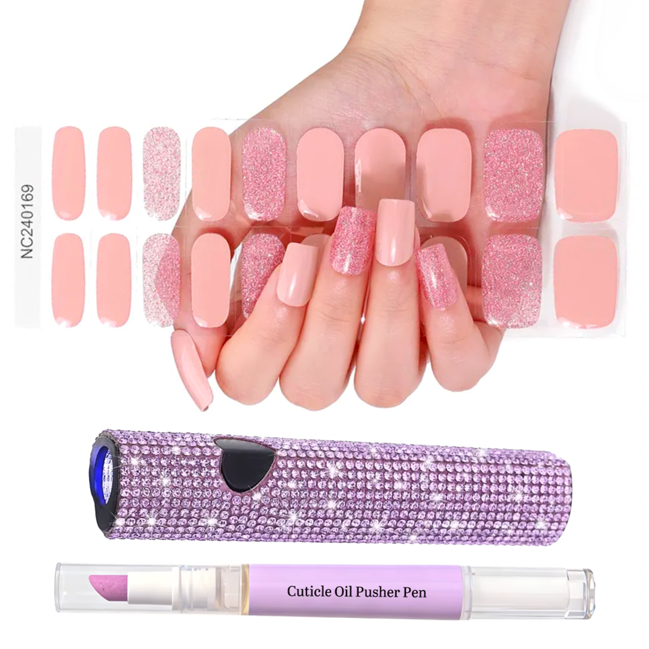 Complete semi-cured gel nail stickers kit including a rhinestone UV lamp and a nourishing remover care oil enriched with natural lavender essential oil, designed for a precise application, easy removal, and a professional salon-quality finish at home. For optimal wear and long-lasting results, the use of a top coat is recommended.