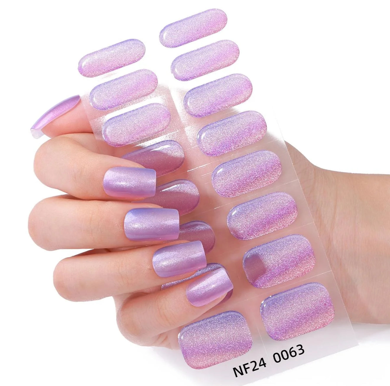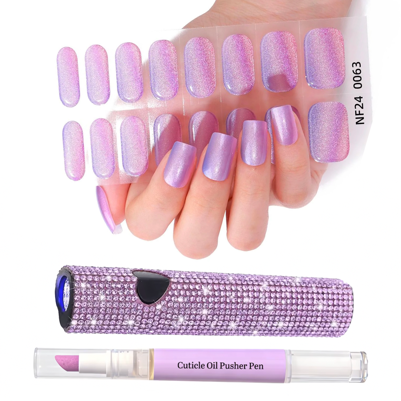 Complete semi-cured gel nail stickers kit including a rhinestone UV lamp and a nourishing remover care oil enriched with natural lavender essential oil, designed for a precise application, easy removal, and a professional salon-quality finish at home. For optimal wear and long-lasting results, the use of a top coat is recommended.