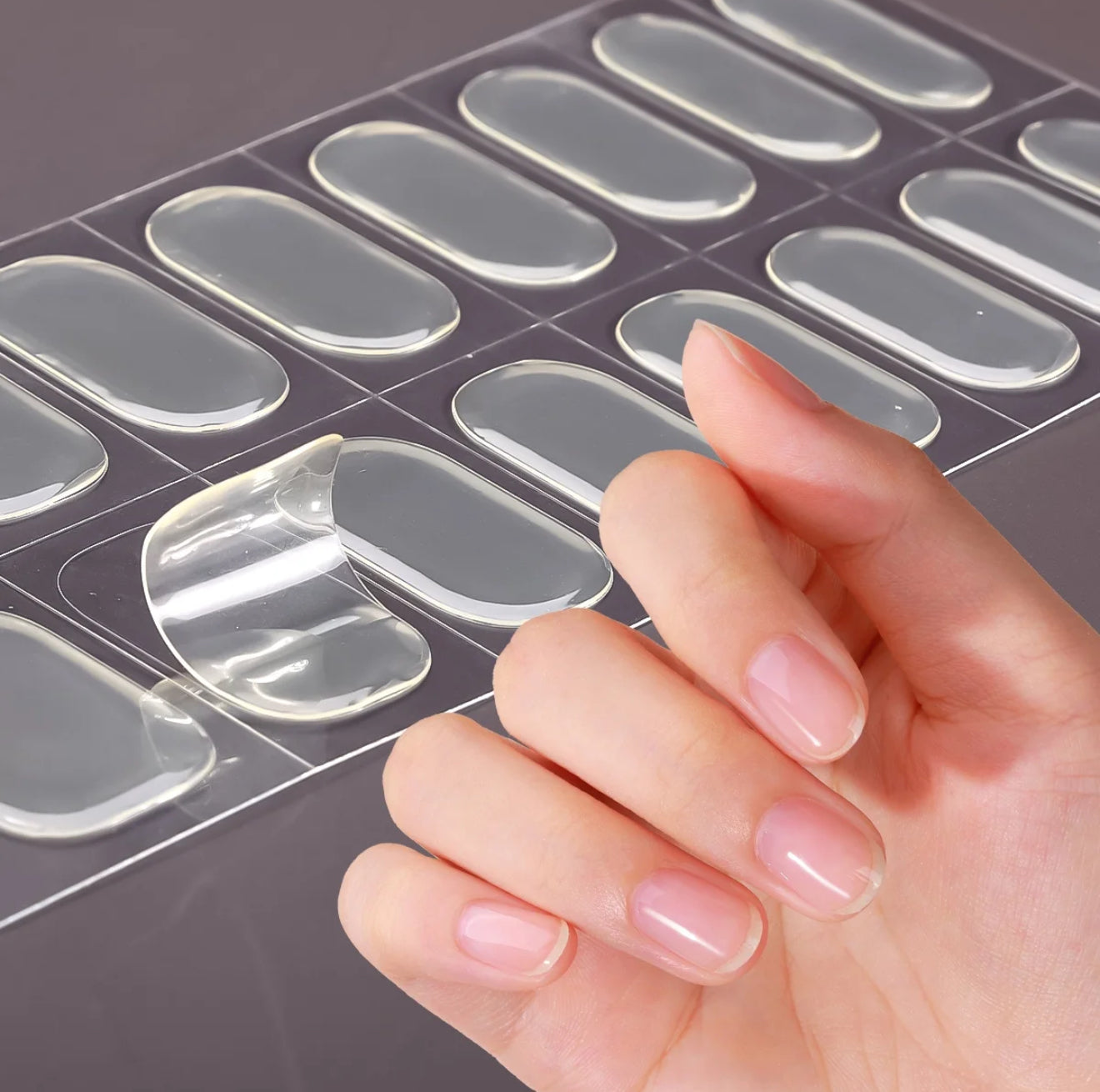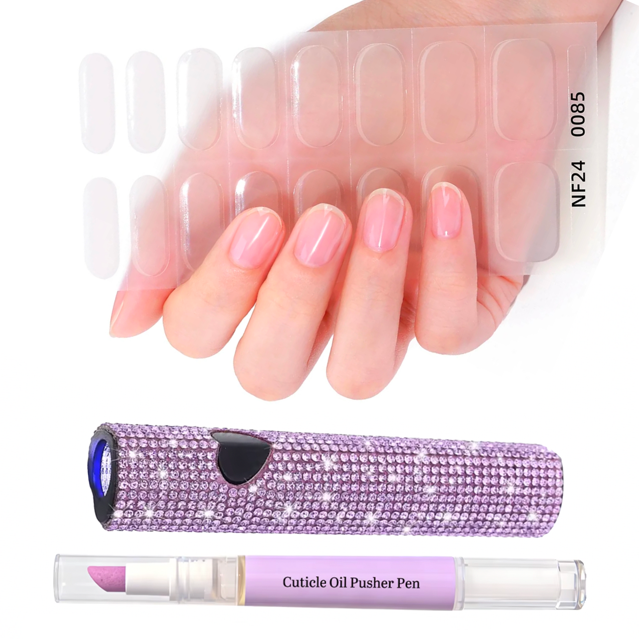 Complete semi-cured gel nail stickers kit including a rhinestone UV lamp and a nourishing remover care oil enriched with natural lavender essential oil, designed for a precise application, easy removal, and a professional salon-quality finish at home. For optimal wear and long-lasting results, the use of a top coat is recommended.